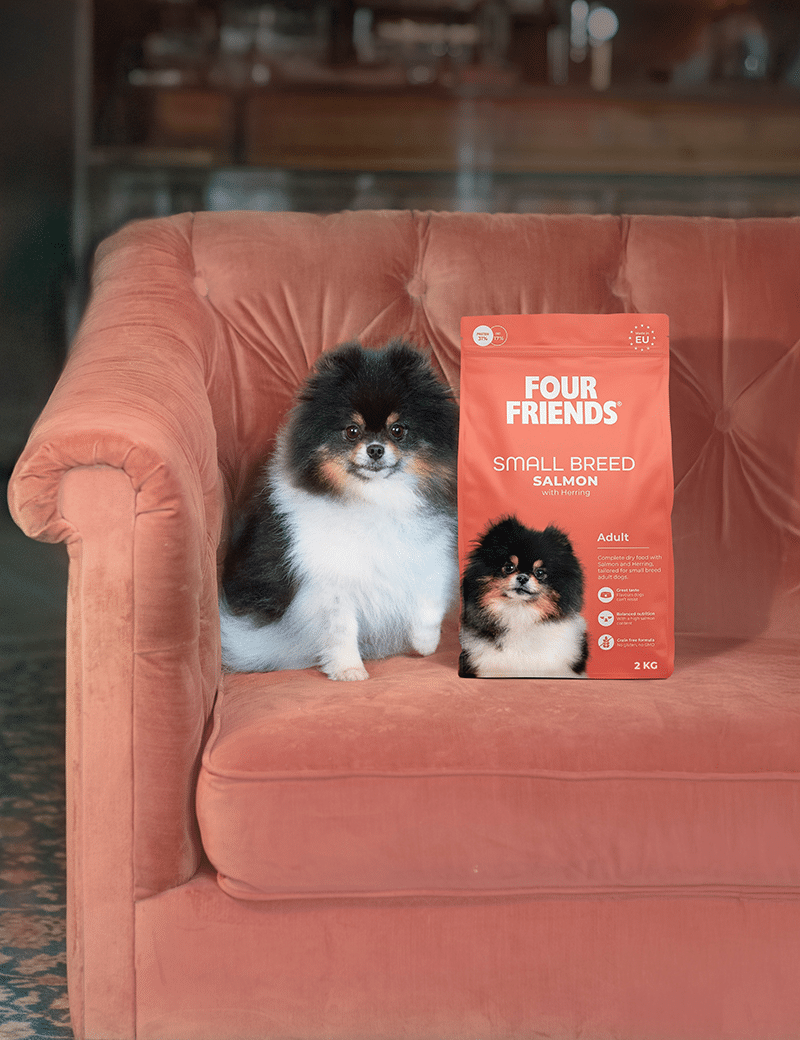 Laxprotein 41 % (torkad lax 26 %, färsk lax 15 %), torkad sill (14 %), ärtor, kycklingfett, kikärtor, bovete, hydrolyserad kycklinglever, torkad äppelmassa, laxolja, linfrö, bryggerijäst, alger (Ascophyllum nodosum), ärtmjöl, mannan-oligosackarider, glukosamin, kondroitinsulfat, frukto-oligosackarider, yucca schidigera, inulin, torkad mariatistel, torkad havtorn, torkad rosmarin, torkad kryddnejlika, torkade citrusfrukter, torkad kamomill, torkad salvia, torkad gurkmeja.
